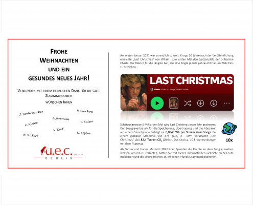 Schätzungsweise 5 Milliarden Mal wird Last Christmas jedes Jahr gestreamt. Der Energieverbrauch für die Speicherung, Übertragung und das Abspielen auf einem Smartphone beträgt ca. 0,0348 Wh pro Stream eines Songs. Bei einem globalen Strommix von 474 gCO2 je kWh verursacht „Last Christmas“ also 82,4 Tonnen CO2 jährlich. Das sind ca. 10 Erdumrundungen mit dem Flugzeug.